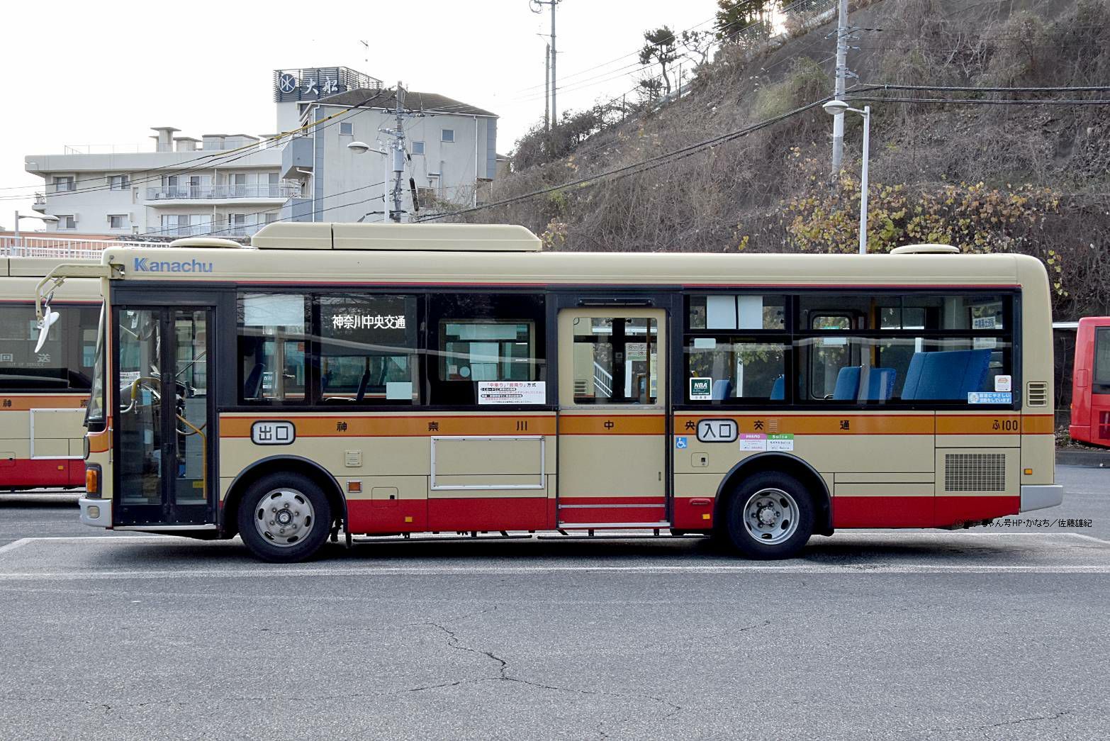 | 2001年6月に投入されたKK-LR233J1改(ふ096)です。は29に続いて投入されたワンステップバスですが一般塗装では初となりました。中扉には手動スロープを装備し、車内にも車椅子固定装置が付いています。藤沢神奈交バスへの管理委託車ですので売店スペースも設置されています。新ステップは装備されなくなりました。 |