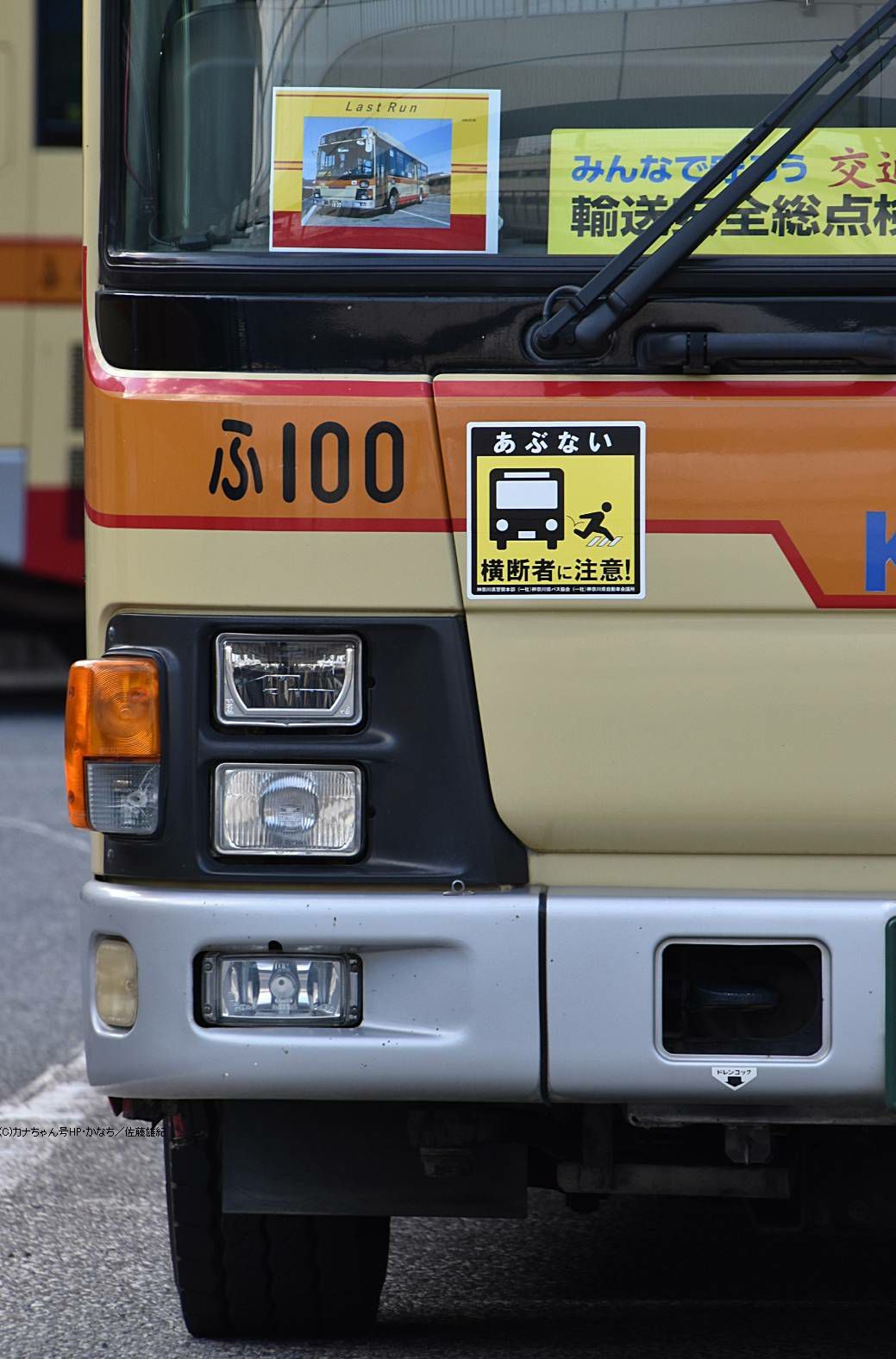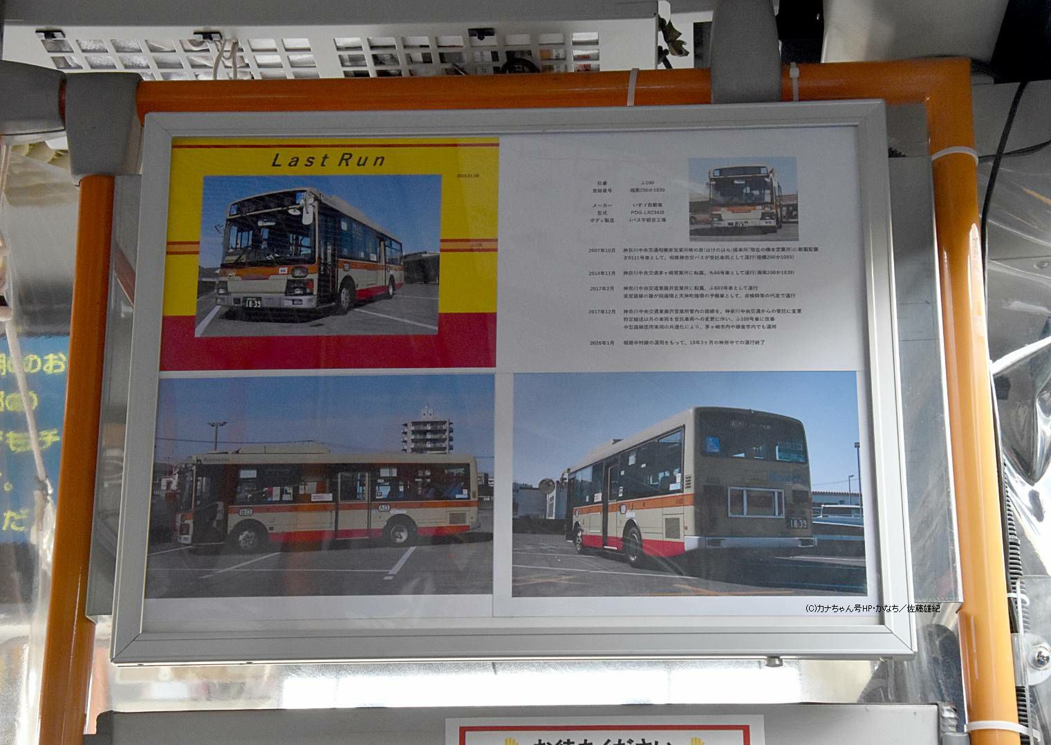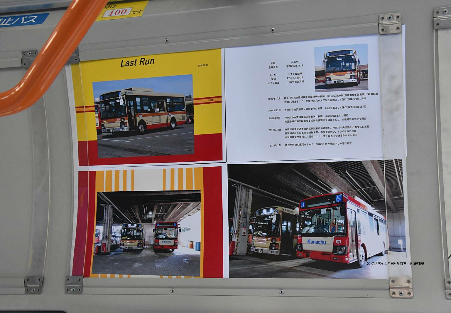 2007年10月投入のPDG-LR234J2(ふ100)です。 PDG-代のエルガミオでは最古参車となっていた1台で、藤沢営業所に在籍するワンステップバスです。 2026年1月8日のラストランをもって運用を離脱しました。最終日は藤が岡循環や城廻中村循環で運行、このまま引退するものと思われます。 新製時は相模原営業所の新車として入り茅ヶ崎や神奈川中央交通東籍も経て現在に至りました(元さ0111→ち66→ふ603)。 フロントのほか車内にもラストを伝えるボードが掲出されました。撮影 佐藤雄紀様 |